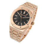 Das Gehäuse und das integrierte Armband sind vollständig aus 18 Karat Roségold gefertigt, was der Uhr eine warme, verführerische Ausstrahlung verleiht. Der Durchmesser des Gehäuses beträgt 41 mm, eine Größe, die eine bedeutende Präsenz am Handgelenk bietet, ohne dabei die Eleganz zu opfern, die für die Royal Oak typisch ist. Die ikonische achteckige Lünette mit ihren sichtbaren Schrauben bleibt ein zentrales Designelement, das sowohl für seine geometrische Klarheit als auch für seine moderne Anmutung steht.