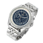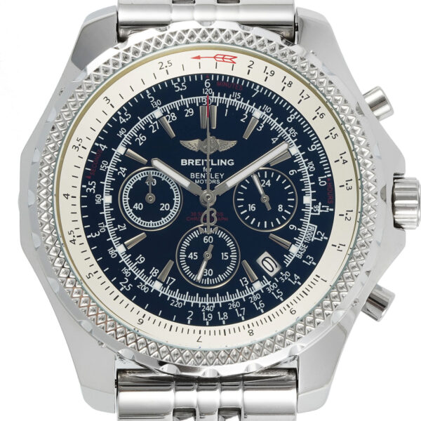 Das massive Edelstahlgehäuse beeindruckt mit seiner markanten Präsenz und einer fein gearbeiteten Lünette im charakteristischen Bentley-Riffel-Design. Diese Detailarbeit spiegelt die unverkennbare Handschrift der Kooperation zwischen Breitling und Bentley wider – kraftvoll, elegant und kompromisslos edel. Das schwarze Zifferblatt unterstreicht den sportlich-maskulinen Charakter der Uhr. Es überzeugt durch seine klare Struktur mit applizierten Indizes, polierten Zeigern und drei dezent platzierten Totalisatoren, die den Chronographen auf eindrucksvolle Weise betonen. Ein Datumsfenster zwischen Vier- und Fünf-Uhr-Position ergänzt das funktionale Design harmonisch.