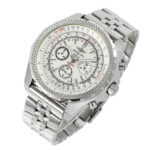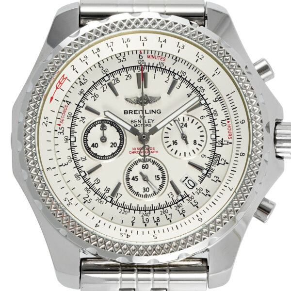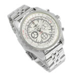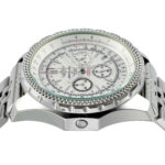 Das beeindruckende Edelstahlgehäuse verleiht der Uhr eine kraftvolle Präsenz, während die ikonische, fein geriffelte Bentley-Lünette sofort den exklusiven Charakter dieser Linie erkennen lässt. Das polierte Finish reflektiert Licht in edler Weise und verleiht der Uhr eine außergewöhnliche Tiefe. Das weiße Zifferblatt bildet dazu einen eleganten Kontrast und verleiht dem Modell eine frische, klare Optik, die Sportlichkeit und Luxus harmonisch miteinander verbindet. Die applizierten Indizes, die glänzenden Zeiger und die drei Chronographen-Totalisatoren sind sorgfältig aufeinander abgestimmt und sorgen für hervorragende Ablesbarkeit sowie ein ausgewogenes Gesamtbild. Ein Datumsfenster zwischen der Vier- und Fünf-Uhr-Position fügt sich dezent und funktional ein.
