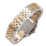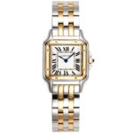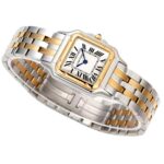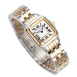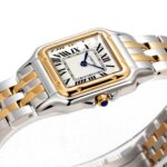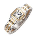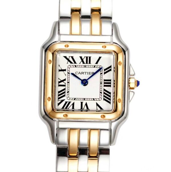 Das Edelstahlgehäuse mit 18k gold im twotone style präsentiert sich in einer perfekt proportionierten, harmonischen Form, die am Handgelenk besonders leicht und angenehm wirkt. Die weich fließenden Linien des Designs erinnern an die elegante Beweglichkeit des namensgebenden Panthers – ein Symbol für Stärke, Grazie und Selbstbewusstsein. Das klassische quadratische Zifferblatt mit römischen Ziffern, blauen Schwertzeigern und der typischen Minuteneinteilung in „Chemin de Fer“-Optik verkörpert den unverwechselbaren Cartier-Stil. Das klare, helle Zifferblatt ermöglicht eine ausgezeichnete Ablesbarkeit und verleiht der Uhr eine besondere Noblesse.
