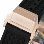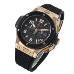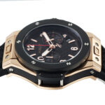 Das Gehäuse der Replica Hublot Big Bang Original Gold Ceramic 44mm im Durchmesser und ist aus 18K 5N Rosegold ( im Original ) gefertigt, das polierte und satinierte Oberflächen aufweist. Diese Verarbeitung verleiht der Uhr Tiefe und ein kräftiges Leuchten, das sich in verschiedenem Licht eindrucksvoll entfaltet. Die Lünette aus schwarzer Keramik bildet einen starken Kontrast zum warmen Gold, während die typischen „H“-Schrauben – ebenfalls ein Markenzeichen der Big Bang Modelle – den sportlichen Charakter betonen.