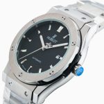 Das Zifferblatt der Replica Hublot Classic Fusion beeindruckt mit seiner schlichten Eleganz. In einem tiefen Schwarz gehalten, bietet es einen stilvollen Kontrast zum glänzenden Edelstahlgehäuse. Die fein gestalteten Stunden- und Minutenzeiger, ergänzt durch dezente Stundenmarkierungen, sorgen für eine klare und unkomplizierte Ablesbarkeit. Das Zifferblatt ist bewusst minimalistisch gehalten, was die Uhr zu einem vielseitigen Begleiter für jede Gelegenheit macht – sei es ein formelles Meeting oder ein entspannter Abend.