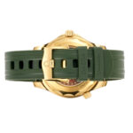 Das grüne Kautschukarmband ist nicht nur optisch perfekt auf das Design abgestimmt, sondern bietet auch hervorragenden Tragekomfort. Es ist weich, widerstandsfähig und passt sich angenehm an das Handgelenk an. Die goldene Dornschließe vollendet das luxuriöse Erscheinungsbild.