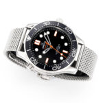 Das 42 Millimeter große Edelstahlgehäuse ist präzise verarbeitet und überzeugt durch ausgewogene Proportionen. Die charakteristische einseitig drehbare Lünette mit schwarzer Keramikeinlage fügt sich harmonisch in das Gesamtbild ein und unterstreicht den professionellen Anspruch der Seamaster-Reihe. Das schwarze Keramikzifferblatt mit den lasergravierten Wellen ist eines der markantesten Merkmale dieses Modells. Je nach Lichteinfall entsteht eine beeindruckende Tiefenwirkung, die dem Zifferblatt eine besondere Dynamik verleiht. Großzügig dimensionierte Indizes und Zeiger sind mit hochwertiger Leuchtmasse versehen und sorgen für eine exzellente Ablesbarkeit.