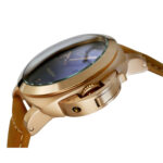 Das 44-mm-Gehäuse dieser exklusiven Luminor Marina besteht aus 18 Karat Rotgold, einer Legierung, die durch einen höheren Kupferanteil eine warme, intensive Farbgebung erhält. Die polierte Oberfläche verleiht der Uhr eine edle Ausstrahlung, während die ikonische Kronenschutzbrücke mit Hebelmechanismus für zusätzliche Sicherheit sorgt.