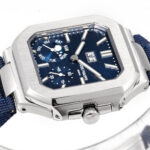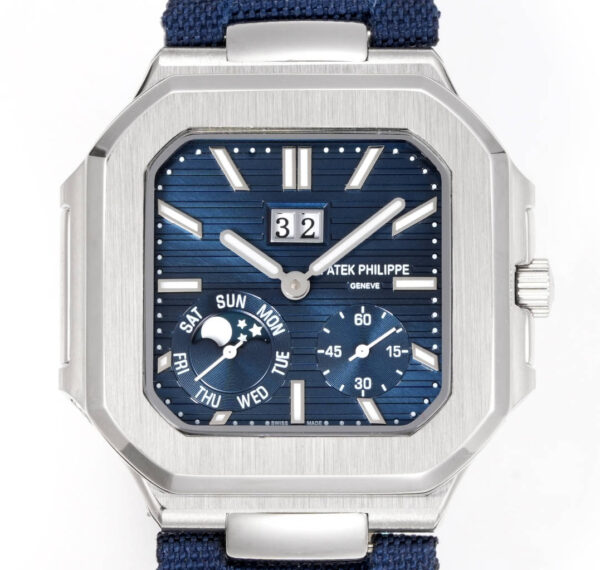 Das Zifferblatt der Replica Patek Philippe Cubitus 5822P-001 ist in einem tiefen, sonnengebürsteten Blau gehalten und mit horizontaler Prägung versehen – diese Struktur verleiht Tiefe und Lebendigkeit, je nach Licht fällt das Blatt unterschiedlich aus. Die Stundenmarkierungen und Zeiger sind aus Weißgold gefertigt und mit Leuchtmasse versehen, womit auch nachts oder in dunkler Umgebung zuverlässige Ablesbarkeit gegeben ist. Das Layout der Anzeigen ist auffallend und zugleich harmonisch: Oben, unter 12 Uhr, befindet sich eine große Datumsanzeige in Doppelapertur („Grand Date“), das Datum springt instantan. Daneben zeigt eine Anzeige unterhalb von 12 Uhr den Wochentag, während die Mondphasenanzeige elegant zwischen 6 und 8 Uhr angeordnet ist. Eine kleine Sekunde rundet das Komplikationsensemble ab.