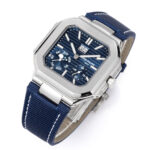 Das Gehäuse ist aus 950er Platin gefertigt, misst 45 mm im Durchmesser und bleibt dabei relativ schlank, etwa 9,6 mm Bauhöhe. Es verbindet polierte und satinierte Flächen, was das Lichtspiel veredelt und eine lebhafte, elegante Oberflächenwirkung erzeugt. Charakteristisch ist die ausgeprägte „square“ Form mit abgerundeten Ecken und angeschrägten Bandanstößen – eine Form, die Sportlichkeit und Eleganz zugleich vermittelt. Ein dezent platzierter Baguette-Diamant bei 6 Uhr in der Lünette gibt dem Modell einen feinen Schmuckakzent, der Luxus subtil unterstreicht.
