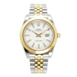 Das 41 Millimeter große Oyster-Gehäuse besteht aus robustem Oystersteel und wird durch Elemente aus massivem Gelbgold ergänzt. Die glatte Lünette aus Gelbgold verleiht der Uhr eine moderne, zurückhaltende Eleganz und unterscheidet sich bewusst von der klassisch geriffelten Ausführung. Sie sorgt für eine klare Linienführung und einen zeitgemäßen Gesamteindruck. Das weiße Zifferblatt wirkt hell, ruhig und ausgesprochen edel. Die applizierten Stundenindizes aus Gelbgold setzen feine Akzente und bieten in Kombination mit den klar gestalteten Zeigern eine ausgezeichnete Ablesbarkeit. Das Datumsfenster bei drei Uhr mit der charakteristischen Zykloplupe rundet das ikonische Erscheinungsbild der Datejust perfekt ab.