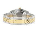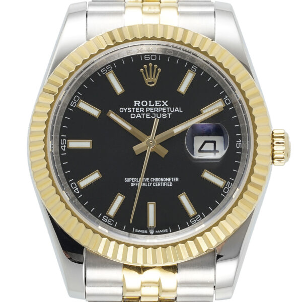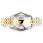 Das 41 Millimeter große Oyster-Gehäuse besteht aus widerstandsfähigem Oystersteel und wird durch eine geriffelte Lünette aus massivem Gelbgold ergänzt. Diese klassische Lünette ist eines der bekanntesten Designmerkmale von Rolex und sorgt für ein lebendiges Spiel aus Licht und Reflexionen. Das silberne Zifferblatt wirkt klar, elegant und ausgesprochen zeitlos. Die applizierten Stundenindizes und fein gearbeiteten Zeiger setzen dezente Akzente und gewährleisten eine hervorragende Ablesbarkeit. Das Datumsfenster bei drei Uhr mit der charakteristischen Zykloplupe verleiht der Uhr ihren unverwechselbaren Datejust-Charakter.