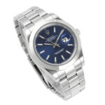 Das 41 Millimeter große Oyster-Gehäuse besteht aus robustem Oystersteel, einem von Rolex entwickelten Edelstahl, der für seine besondere Widerstandsfähigkeit und seinen edlen Glanz bekannt ist. Die glatte Edelstahllünette unterstreicht den modernen Charakter dieser Referenz und verleiht der Uhr eine klare, puristische Linienführung. Das blaue Zifferblatt ist das visuelle Highlight dieses Modells: Je nach Lichteinfall changiert es zwischen tiefem Dunkelblau und lebendigem Sonnenschliff und verleiht der Uhr eine elegante Tiefe. Die applizierten Stundenindizes und die fein gearbeiteten Zeiger sorgen für eine ausgezeichnete Ablesbarkeit und fügen sich harmonisch in das aufgeräumte Zifferblattdesign ein. Das Datumsfenster bei drei Uhr mit der charakteristischen Zykloplupe verleiht der Uhr den unverkennbaren Datejust-Look.