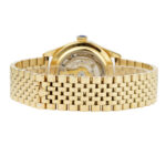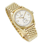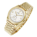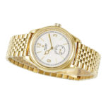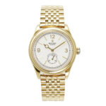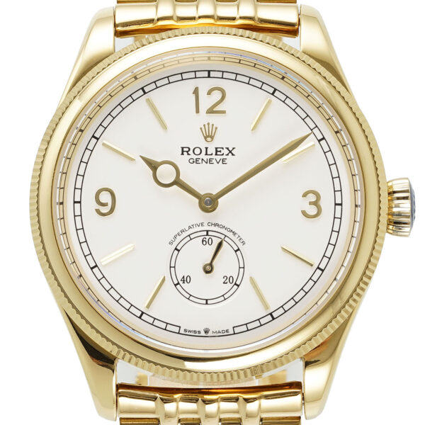 Das 39 Millimeter große Gehäuse besteht aus massivem 18 Karat Gelbgold und überzeugt durch seine schlanke, ausgewogene Silhouette. Die fein proportionierten Bandanstöße und die elegante Lünette mit polierten und sanft gewölbten Flächen verleihen der Uhr eine klassische Anmutung, die an historische Rolex-Modelle erinnert. Das helle Zifferblatt präsentiert sich klar und harmonisch gestaltet, mit applizierten arabischen Ziffern und Indizes, die dem Design Tiefe und Charakter verleihen. Die kleine Sekunde bei sechs Uhr unterstreicht den traditionsbewussten Anspruch dieser Uhr und sorgt für eine elegante, ruhige Zifferblattarchitektur.