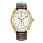 Das weisse Zifferblatt ist klar gegliedert und zeigt feine arabische Ziffern bei 3, 9 und 12 Uhr sowie stabförmige Indizes. Die Schwertzeiger aus Gelbgold, kombiniert mit einem kleinen Sekundenzeiger auf 6 Uhr, ergeben eine ruhige, klassische Optik mit perfekter Ablesbarkeit. Der „Superlative Chronometer“-Schriftzug unterstreicht die technische Exzellenz dieser Uhr, ohne das dezente Gesamtbild zu stören.